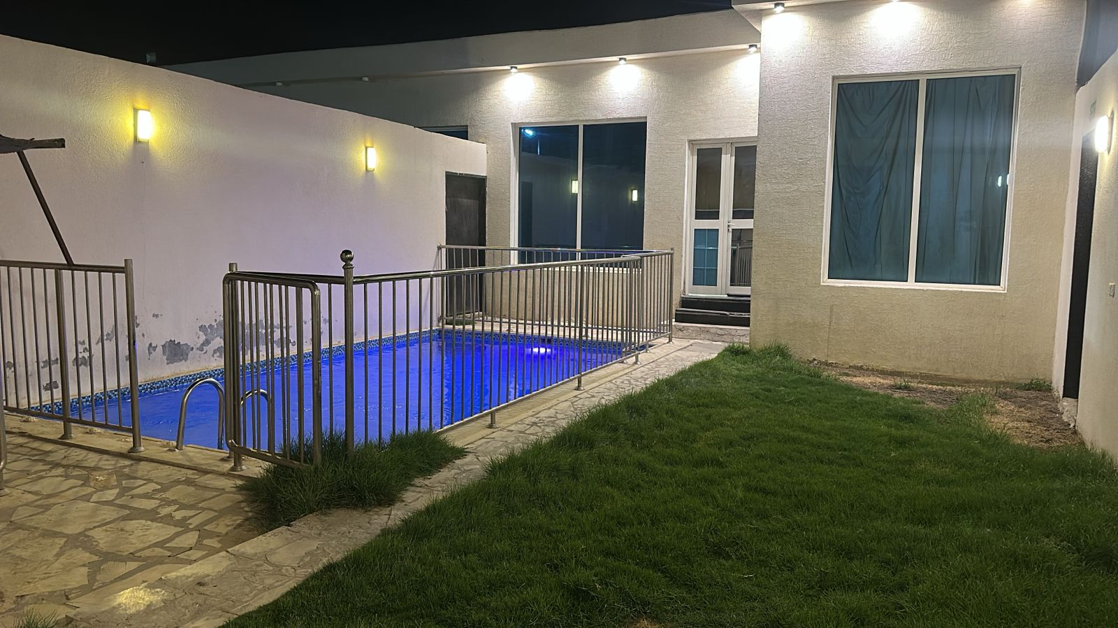 الشاليه يتكون من مساحة 300 متر مربع 1- مدخل عادي 2- مسطح اخضر -4- مسبح 7*4 عمق 180 مدرج الى 180 - صالة 10*6 تتسع من 15 الى 25 شخص مزودة بليازر وسماعة دي جي - لدات -ديكورات مضيئة-دورتين مياة مع المغاسل 7- غرفة نوم مساحة 4*6 سرير نفرين مع دورة مياة خاصة 8- مطبخ مزود بادوات ثلاجة -غلاية -عيون فرن كهرباء 9- طاولة طعام تتسع 4 اشخاص 10- خدمة توصيل بقالة 11- خدمة توصيل مطاعم - ملحق خارجي مزود بدورة مياه مع مغاسل